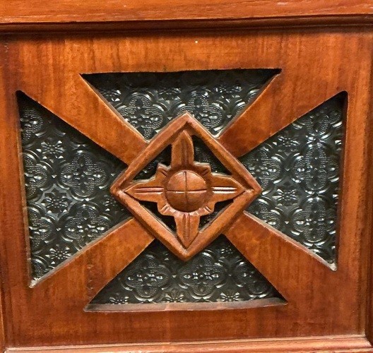 Vintage single-door wooden stand with etched glass, hinged door/cubby storage, and bottom shelf. Dimensions: 32" X 14.5" X 18". Located on the third floor.