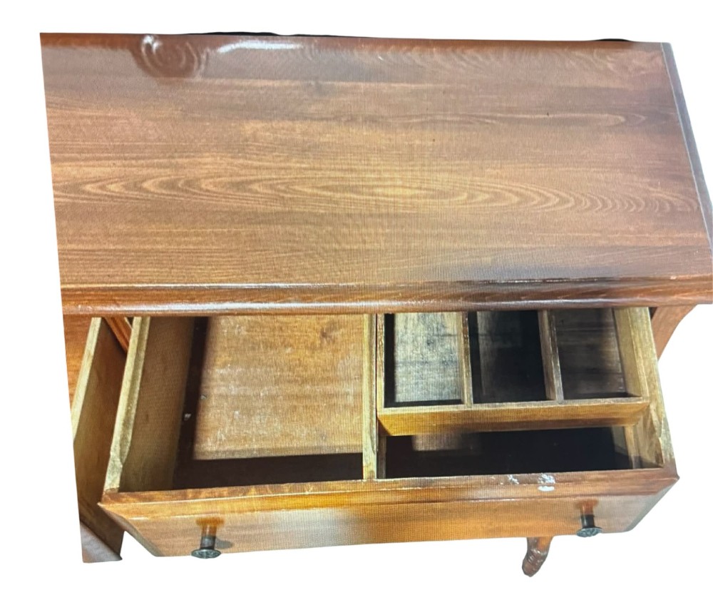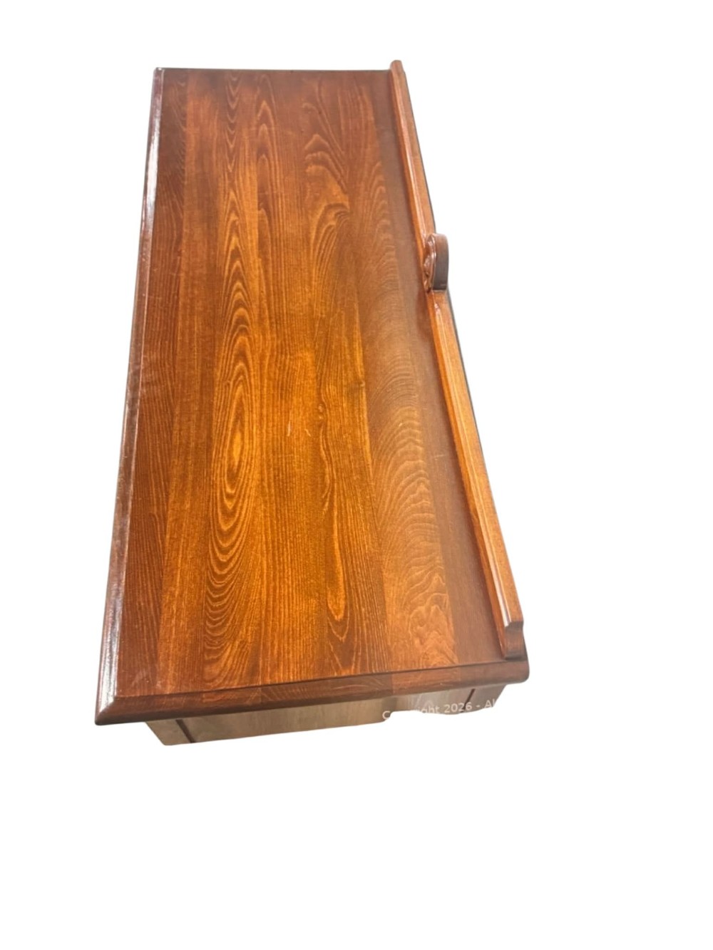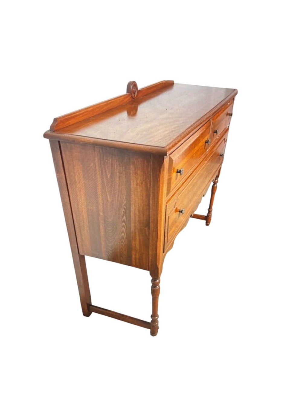 Nice vintage buffet/server with two drawers over one. One drawer has a box for utensils/silverware. Dimensions include: 41" W by 17.5" D by 48" H. Good storage with a nice warm vintage look. Available on the third floor.