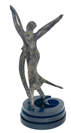 Though unsigned, the design of these figures’ bears design influences from the renowned works of Franz Hagenauer, reflecting the iconic aesthetics of the era. It is presented on a carved asymmetrical ebonized three-tiered pedestal base, measuring 22.25 inches in height and 9.5 inches in width with a depth of 8.5 inches, this ensemble commands attention with its bold presence. This fine piece is ready to grace your space with its elegance and charm and is a testament to the enduring allure of Art Deco design.