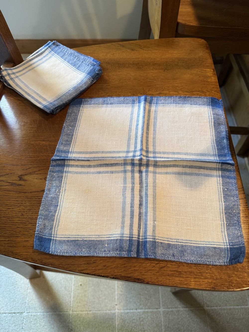 Set of 5 White and Blue Linen Napkins.Excellent Condition. 12 X 12 inches