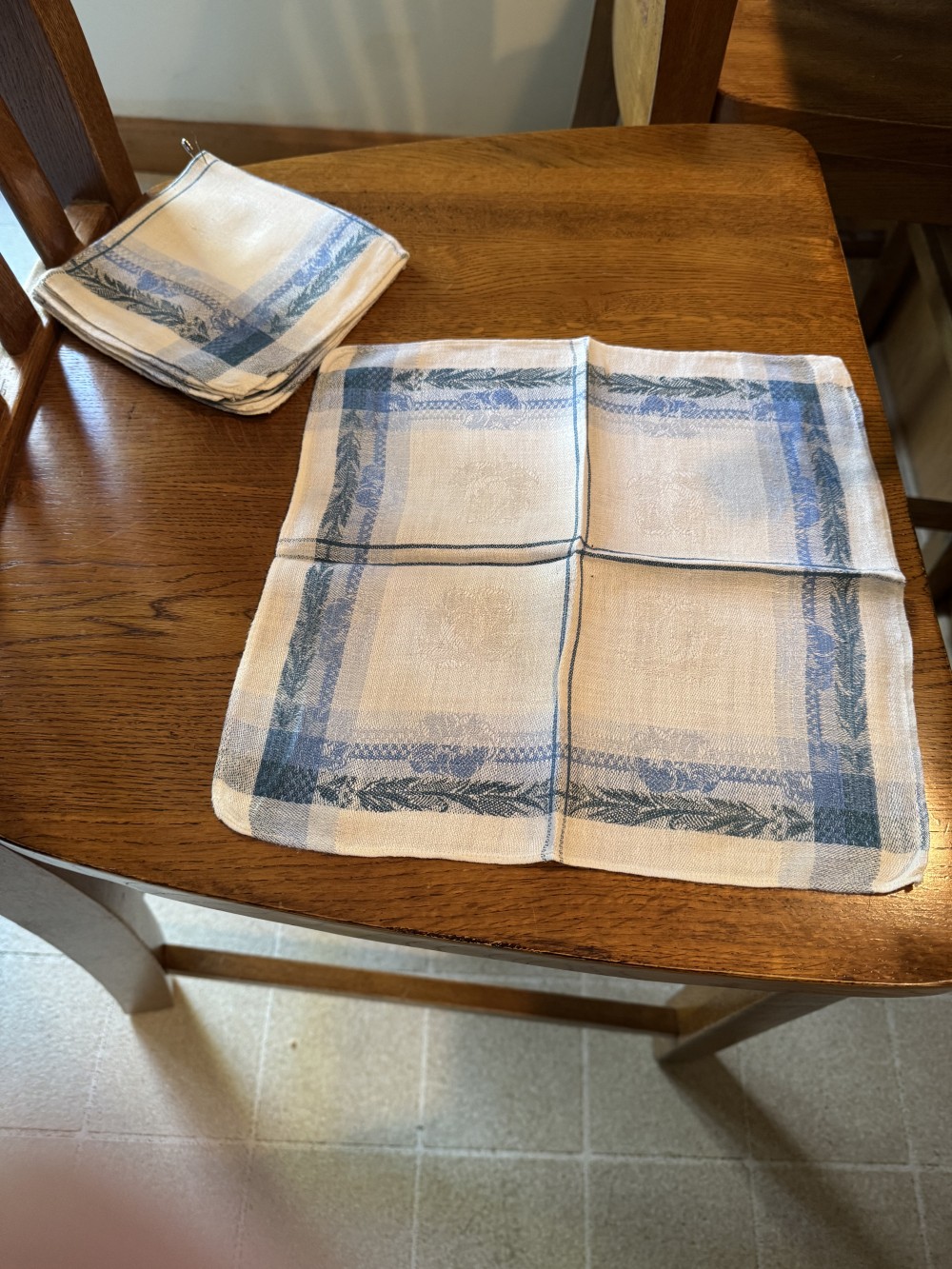Set of 5 White, Blue and Green Leaf Border Design Linen Napkins.Like New Vintage. 12 X 12 inches